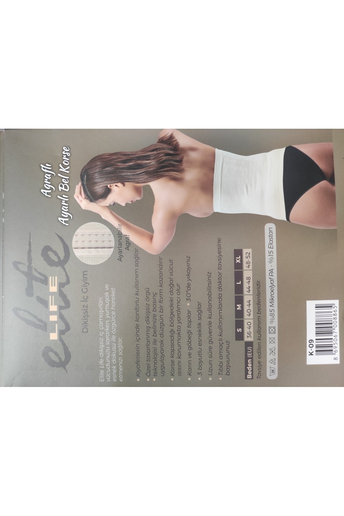 Elite Life dikişsiz iç çamaşırları vücudunuzu sararken, yumuşak ve esnek dokusu ile özgürce hareket etmenizi sağlar ; Kıyafetlerin içinde konforlu kullanım sağlar ; Özel tasarlanmış dikişsiz örgü teknolojisi ile belinize basınç uygulayarak düzgün bir form kazandırır. ; Bel korse kapsadığı bölgedeki doğal vücut ısısını korumaya yardımcı olur. ; Elite Life ayarlanabilir bel korsesi karın ve göbeği toplar ; 30 derecede yıkayınız. ; 3 boyutlu esnek yapısı ile göbek bel sıkılaştırıcı özelliğine sahiptir. ; Uzun süre güvenle kullanabilirsiniz ; Tıbbı amaçlı kullanımlarda doktor tavsiyesine başvurunuz. ; Elite Life Bel Korse ürünü %85 Mikroelyaf PA – %15 Elastan’dan üretilmiştir. ; Kaymayı önleyen silikon bantlara sahiptir. ; Bel korsesi 1 beden küçültür. ; Bel Göbek Incetici Toparlayıcı Korse ürünümüz ayarlanabilir agraf özelliğindedir. ; Elite Life Agraflı Ayarlı Bel Korsesi ürünümüz ; ; 36 – 40 Beden için S Beden uygundur. ; 40 – 44 Beden için M Beden uygundur. ; 44 – 48 Beden için L Beden uygundur. ; 48 – 52 Beden için XL Beden uygundur. ;