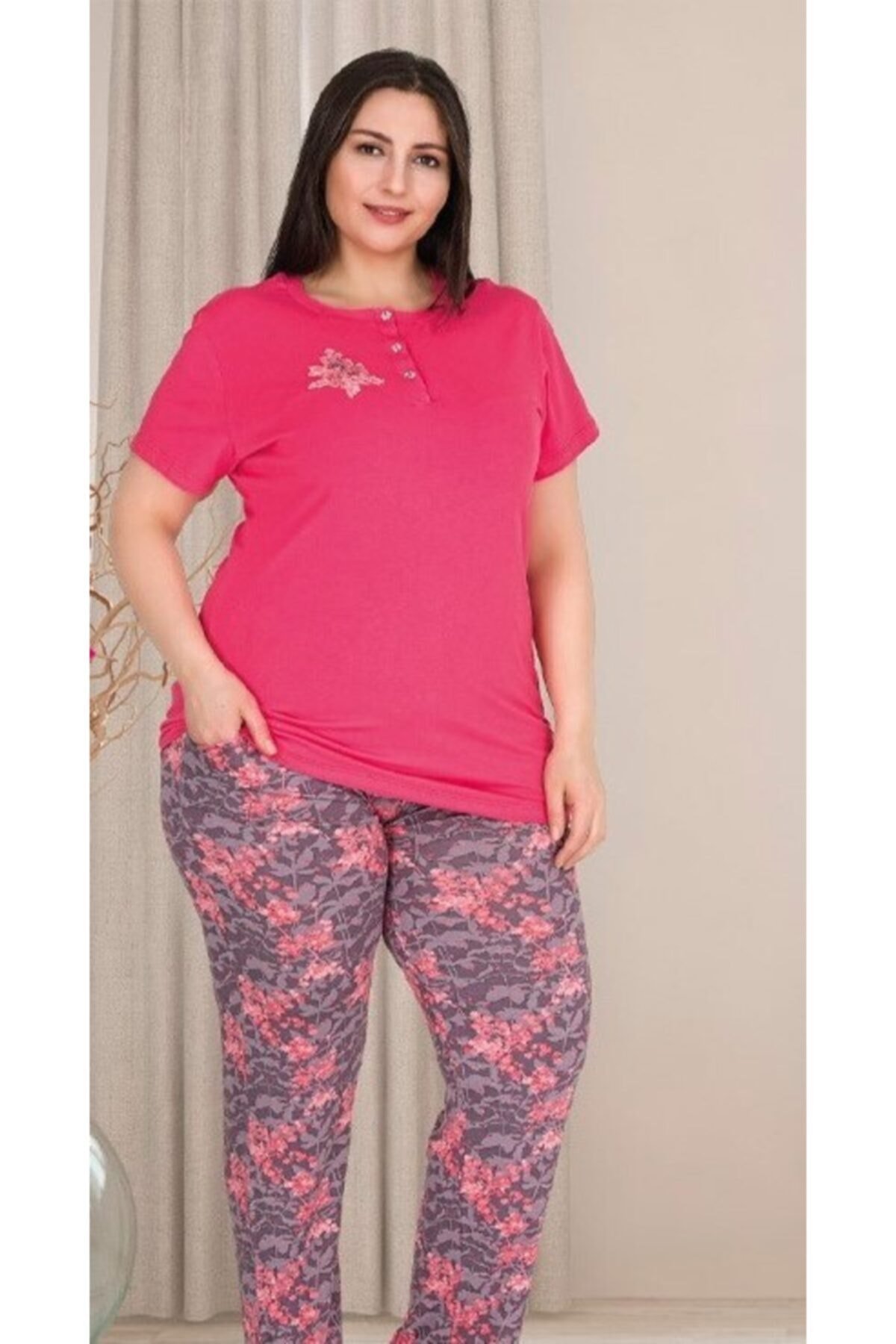 büyük beden pijama takımı üst kısmı düğmeli pembe renkli alt kısmı füme renginin üstüne pudra renkli çiçek deseni ile uyum sağlanmıştır. rahat ve günlük kullanıma uygundur